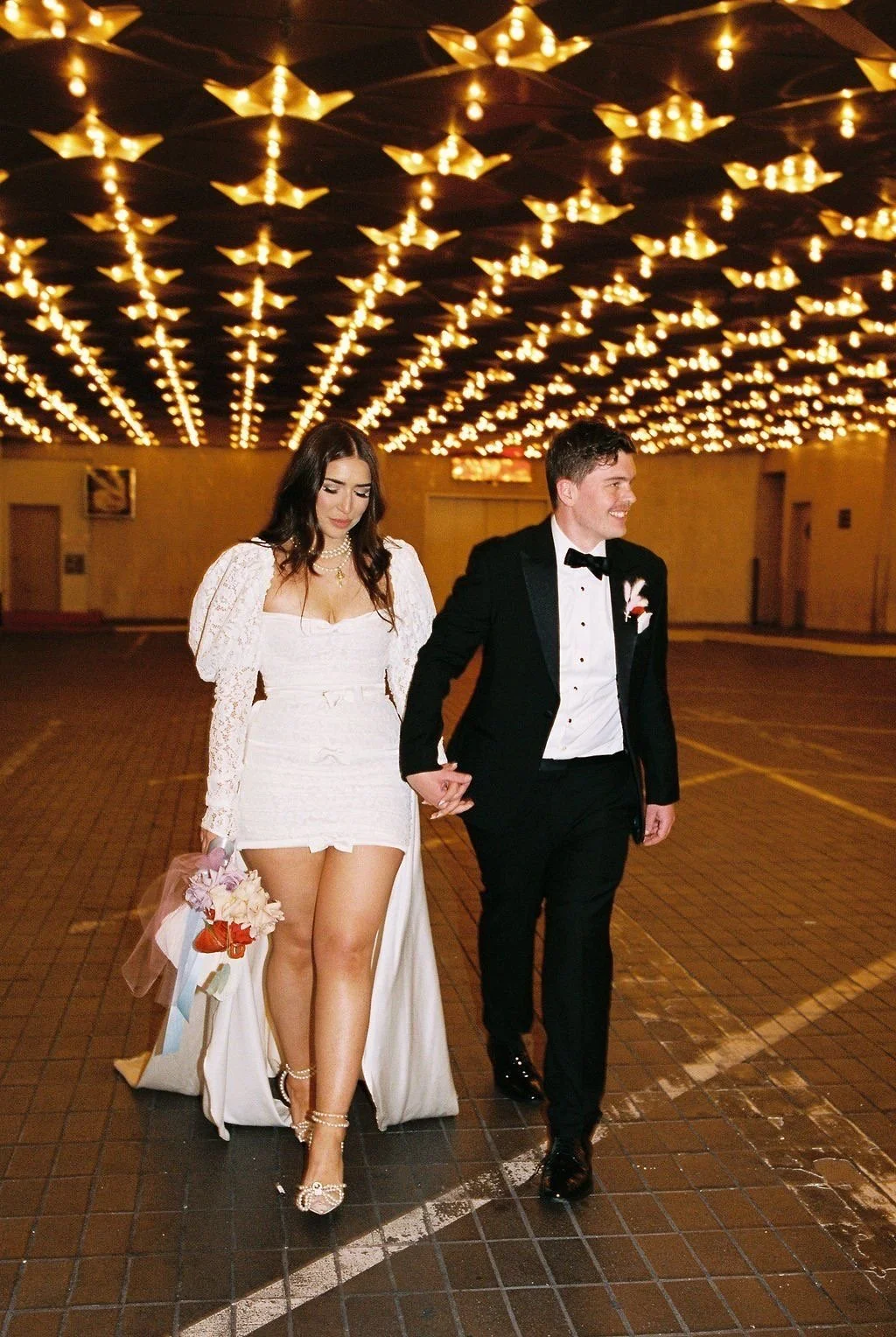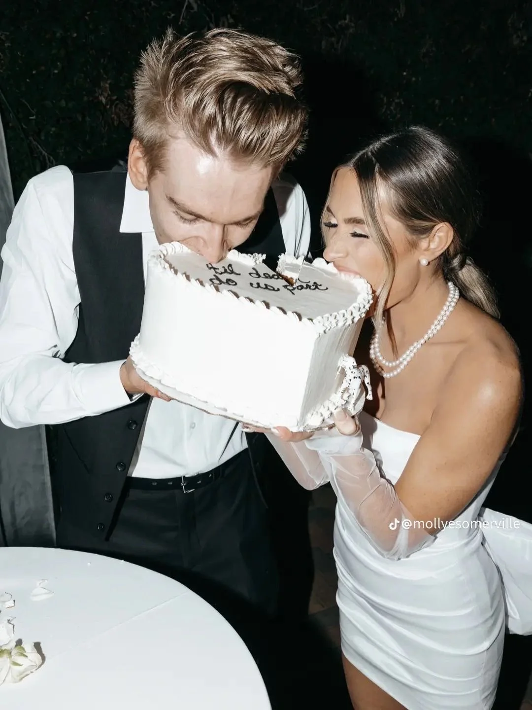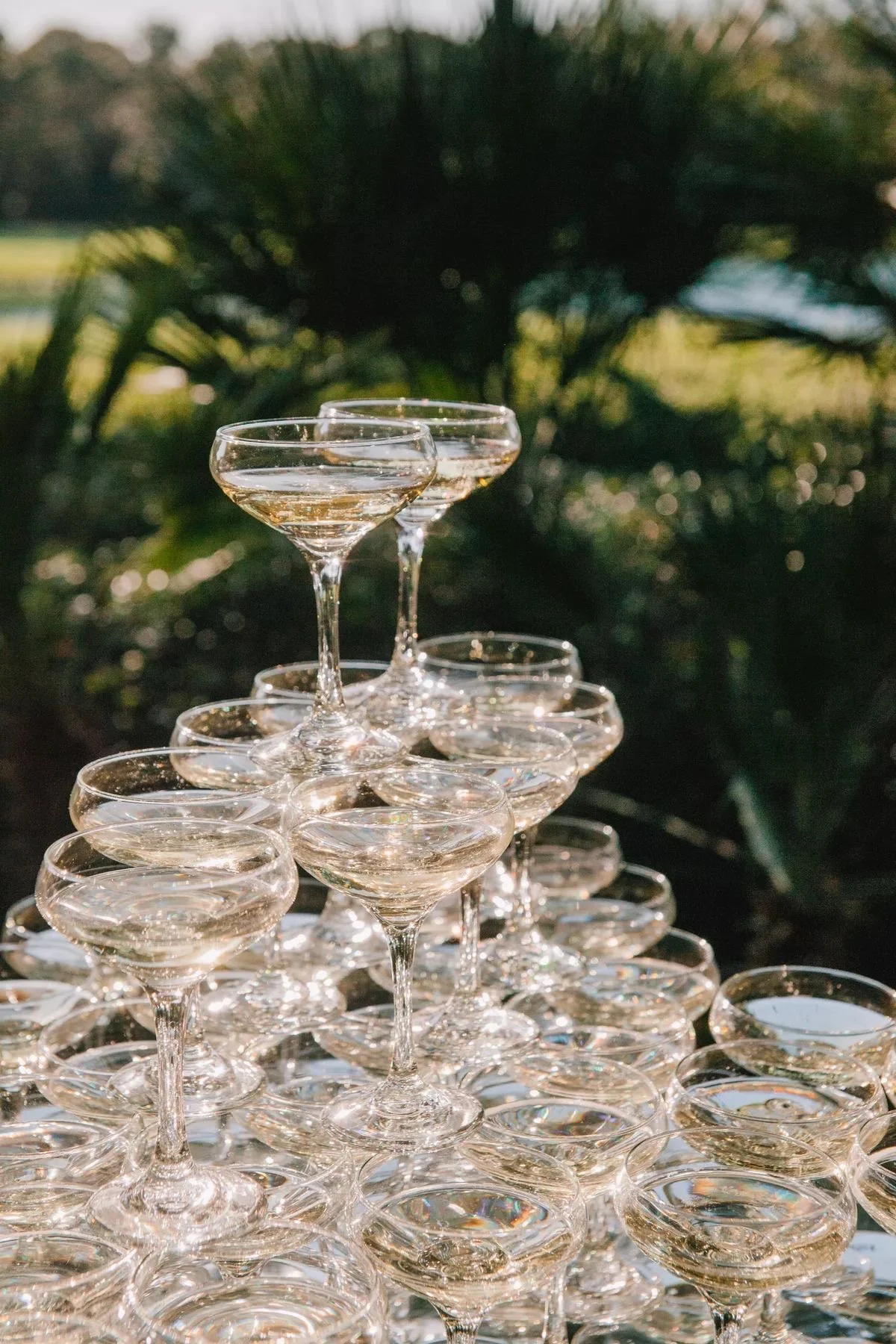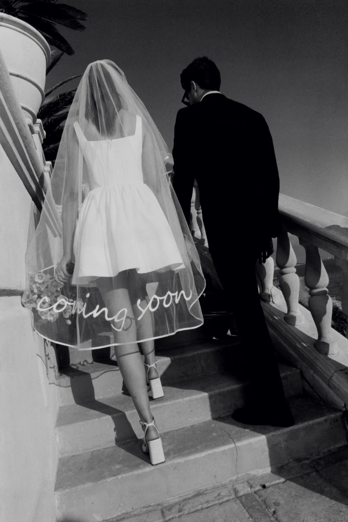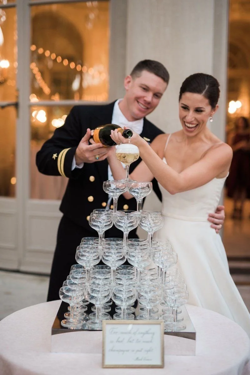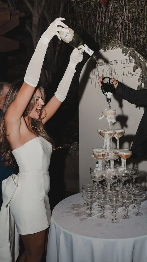 Props: Champagne tower, small white cake, white sleeves, bouquet, veil
