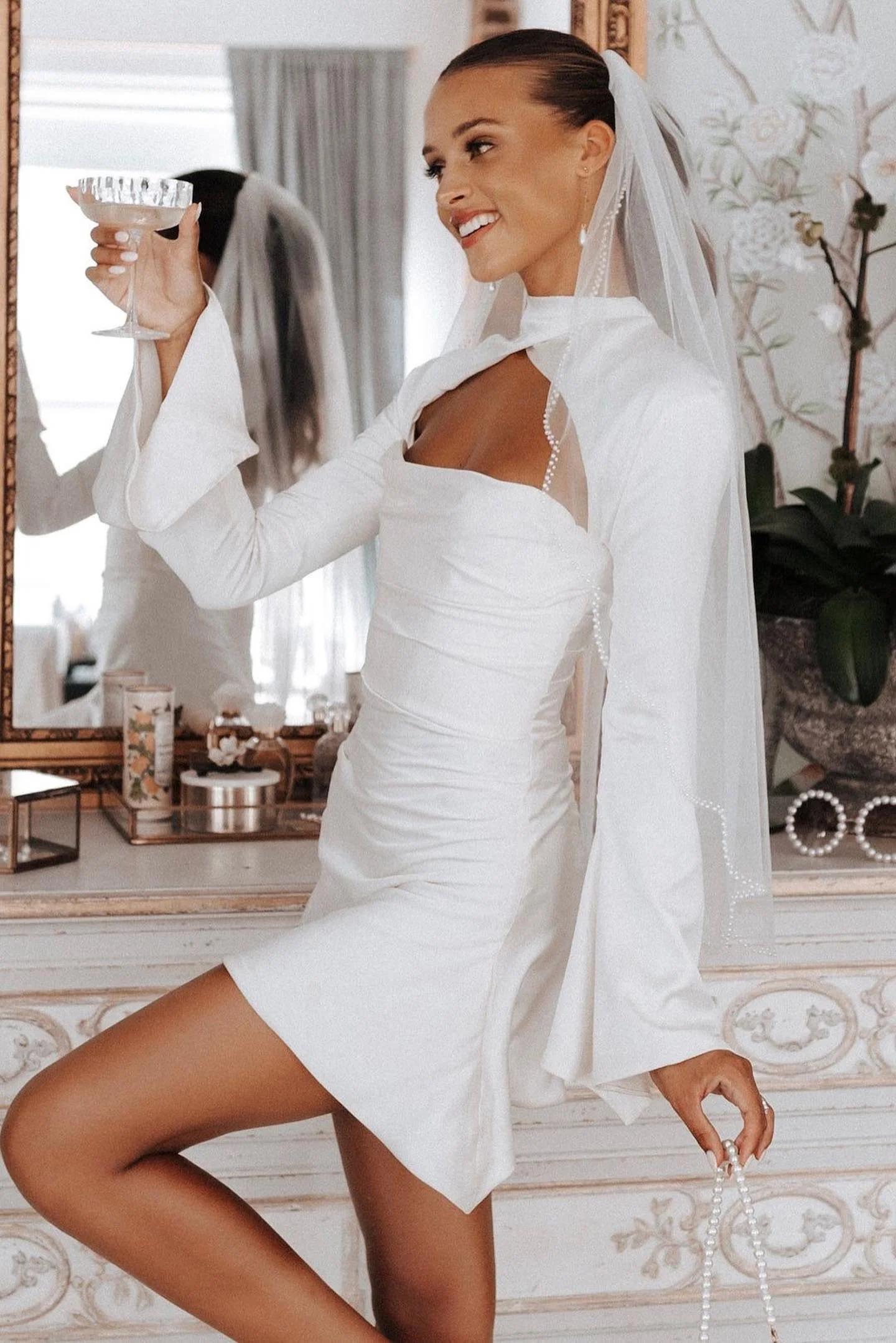 Props: White sleeves, bouquet, veil, perfume, details, sunglasses, champagne
